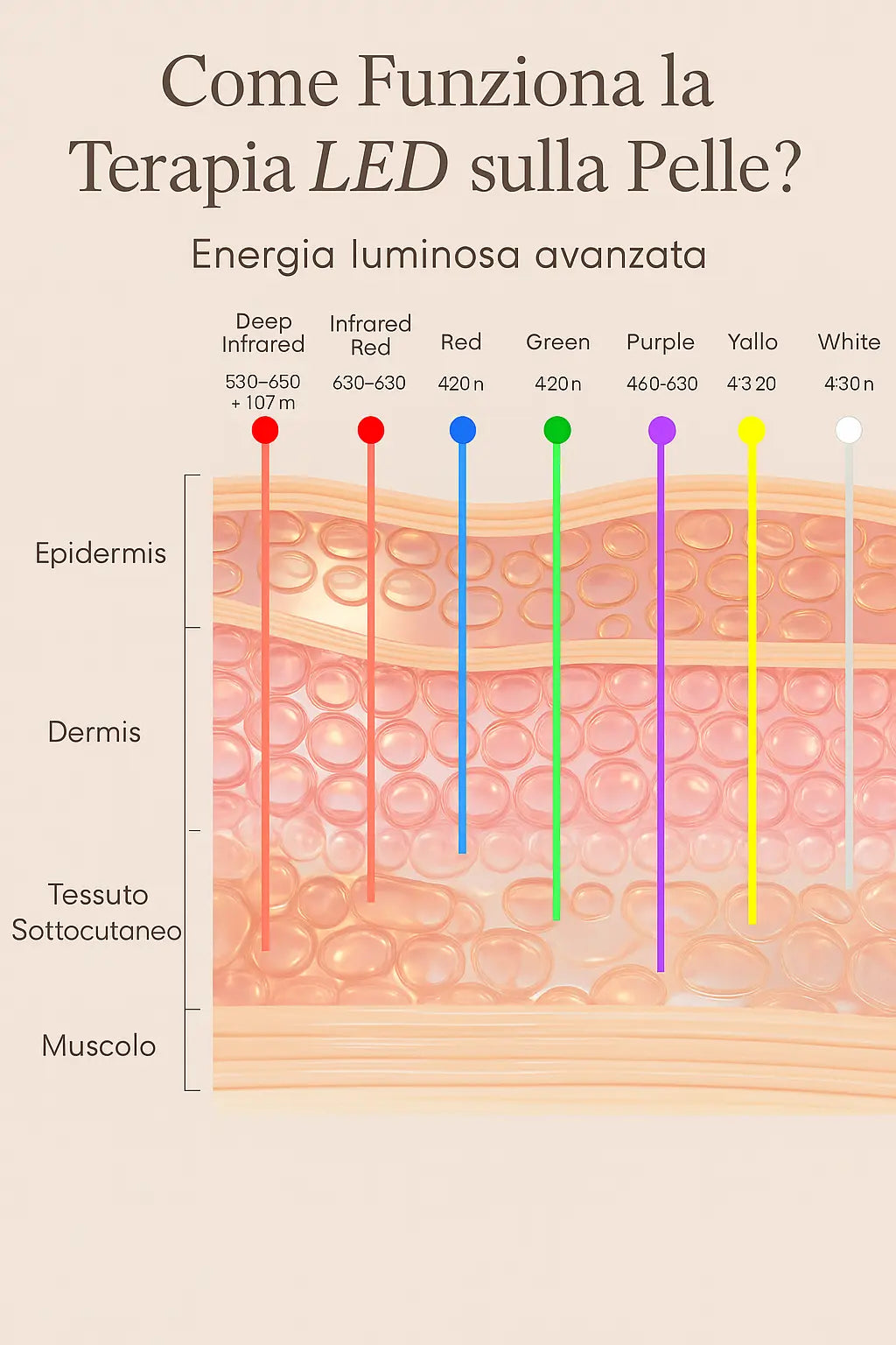 La maschera emette luce a diverse lunghezze d'onda che penetrano la pelle a profondità differenti. Queste luci stimolano processi naturali come la produzione di collagene, riducono i batteri e migliorano il tono e la texture della pelle.